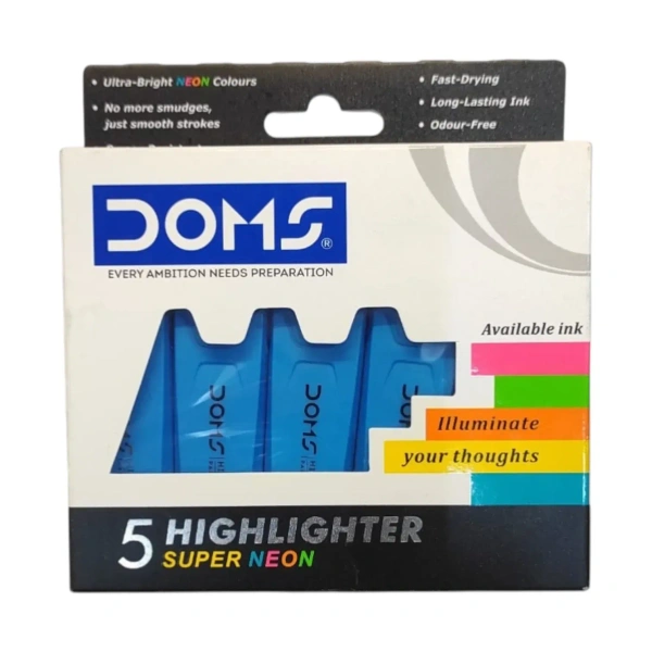 Brighten up your notes, highlight key points, and bring your work to life with the Doms 5 Highlighter Super Neon Pack. Designed for precision and vibrancy, these highlighters are perfect for students, professionals, and anyone who loves to stay organized. Manufactured by the trusted Doms Industries Pvt. Ltd., these highlighters are a must-have addition to your stationery collection.