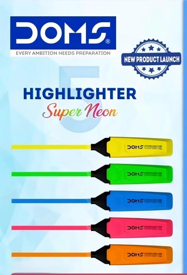 Elevate your note-taking, studying, and organizing with the Doms 5 Highlighter Super Neon Pack of 5 Pieces. Designed for those who value precision and vibrant colors, these highlighters are a must-have for students, professionals, and creatives alike. Manufactured by Doms Industries Pvt. Ltd., a trusted name in stationery, these highlighters deliver unmatched quality and performance.